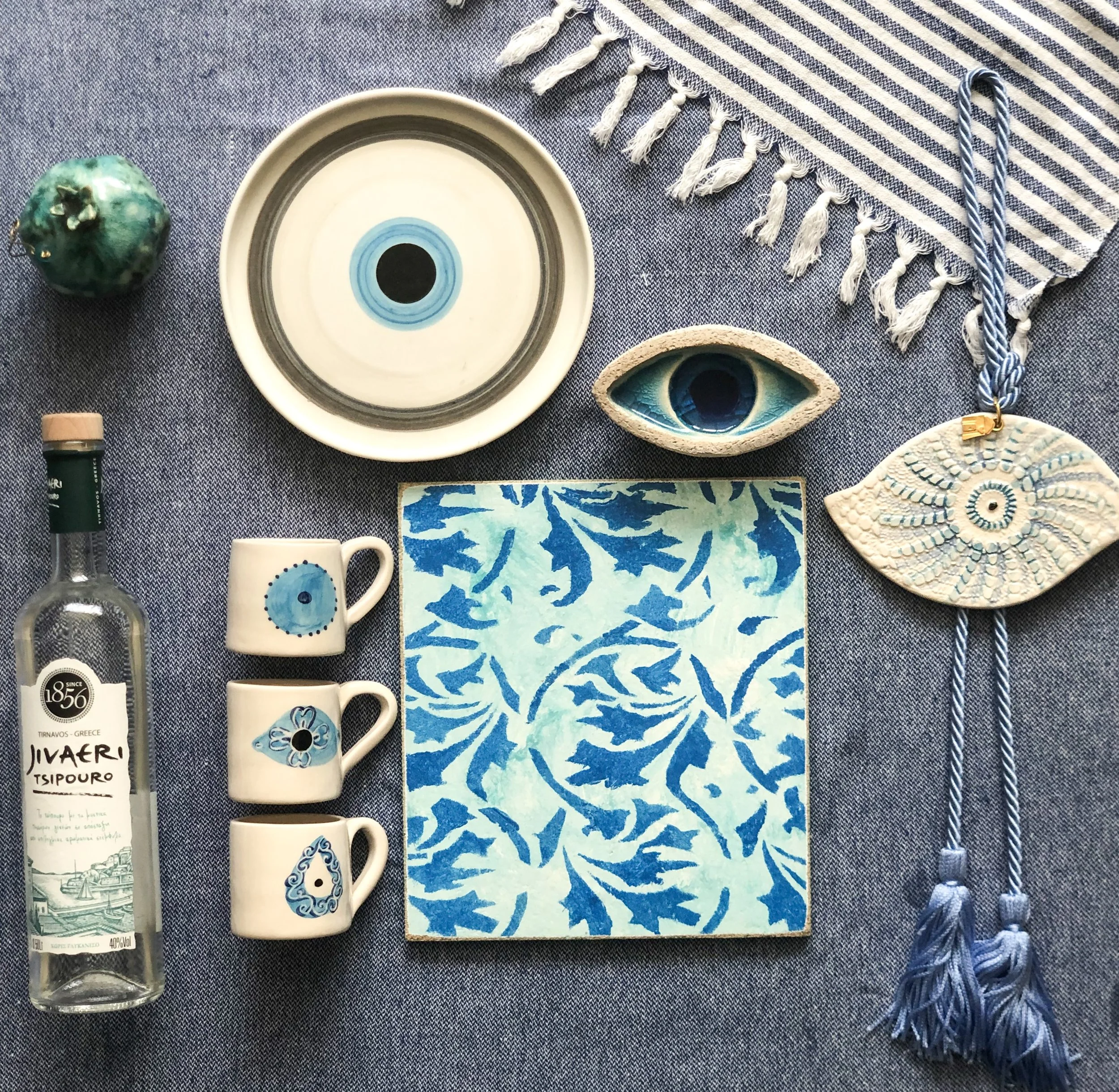 While upon my first visit to Greece I may have collected a few more classic souvenirs that I’m not even sure have withstood the test of time, on subsequent visits I started to look at things a bit differently. From throw pillows, to platters, to coffee table decor, I started to collect pieces that I felt captured the essence of my time there. Beautiful blues, evil eyes, and different items I’d see hung on the walls of someone’s home or in a restaurant, all started to pull my attention.